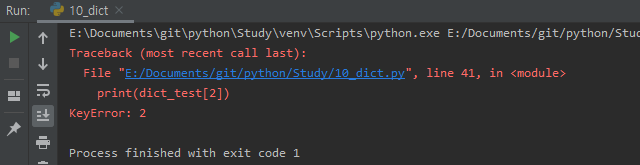dict_test 에는 2 라는 키가 없습니다. 없는 키에 대해 참조가 일어날 경우 파이썬은 에러가 발생하고 실행이 중지 됩니다.