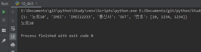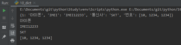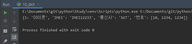 dict_test = {1:"아이폰", "IMEI":"IMEI12233", "통신사":"SKT", "번호":[10,1234,1234]}