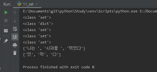그러므로 비어 있는 set 타입 객체를 만드려면 set_test3 처럼 set() 으로 초기화 해 주도록 합시다.